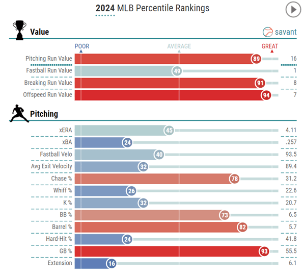 Houck’s percentiles portray his ability to have success without an overpowering fastball (40th percentile). His recipe is in his mix of coiling shapes, inducing groundballs at an elite level (93rd percentile) and mitigating hard contact (82nd percentile in barrel rate).