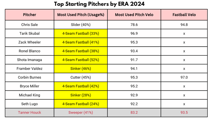 Figure 3: Top 11 starters in ERA 2024. Predominantly fastball pitchers highlighted in yellow