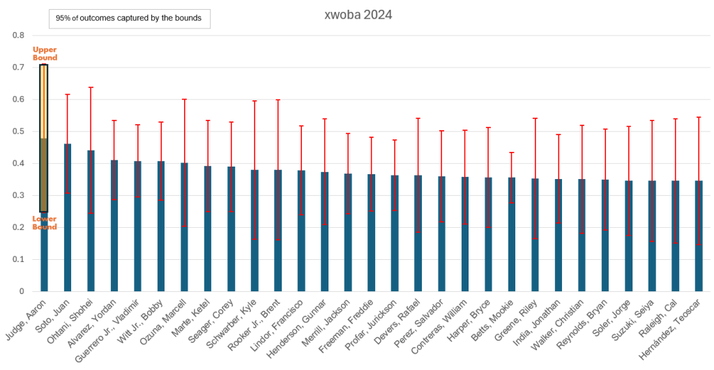 You can see that Judge led the league in xwOBA, but with a larger range of outcomes than other top performers. Soto had a similar xwOBA, along with a tighter range of outcomes. Vlad Jr and Bobby Witt also ranked highly, with low variance.