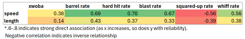 The big headline here is that bat speed leads to top end run creation. However, much like the 3-point revolution, the big headline can be an over-simplification for the sake of accessibility. Moreover, teams need to examine surrounding variables to assess improvement in the margins. So, as seen in the matrix above, despite the allure of a fast bat, swing speed is also directly associated with whiffs and strikeouts, while inversely correlated with square-up rate.