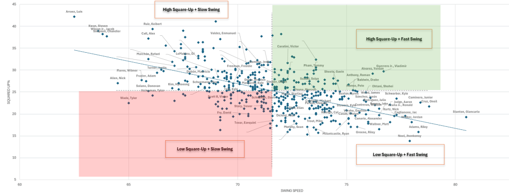 Players that swing hard make contact less on average and with lesser ability to square up, but we’re seeing that the tradeoff is worth it given that fast bats have higher wOBA (.38 correlation coeff between wOBA and swing speed). But given these correlations, what if we can optimize swings by getting the upside without sacrificing the contact?