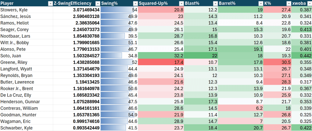 As established, players that have fast swings, have long swings on average. Players like Gunnar Henderson and Vlad Jr however circumvent the trend by having fast but short swings (lower right quadrant). How do players like this fare in the stat sheets? the following table is sorted by swing efficiency (for ex: 3.0 z-swing eff = 3 standard deviations above average swing efficiency), for players with above average bat speed: