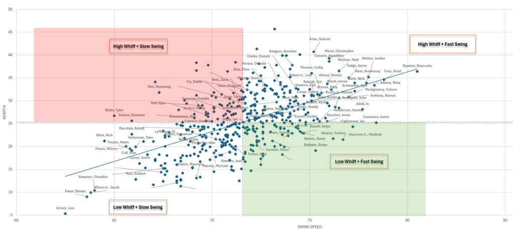 Swing speed is a metric that was released by MLB statcast in the 2024 season. MLB analysts have emphasized the significance of the measure since its release. The quantification of bat speed (mph) revealed a strong association with hard hit rate. This is a key learning circulated around baseball as they’ve leaned into hard contact over batting average.